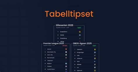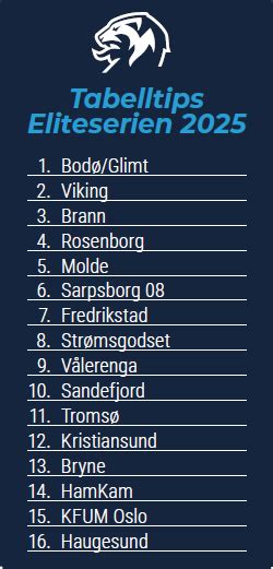 28 Mar 2026 — Tabelltips Eliteserien · 1. Bodø/Glimt · 2. Molde · 3. Rosenborg · 4. Viking · 5. Brann · 6. Fredrikstad · 7. Vålerenga · 8. Tromsø. 9. 30 Mar 2026 — Tabelltips Eliteserien: Glimt-dominans! · 1. Bodø/Glimt · 2. Rosenborg · 3. Molde · 4. Fredrikstad · 5. Brann · 6. Viking · 7. Sarpsborg 08 · 8. Tabelltips Eliteserien 2026: Suverent Glimt-gull 27 Jan 2026 — Kamikaze-tips Eliteserien 2026 · 1. Bodø/Glimt · 2. Rosenborg · 3. Viking · 4. Brann · 5. Molde · 6. Vålerenga · 7. Fredrikstad · 8. Sarpsborg. 19 Mar 2026 — Vi spør tabellplassering på samtlige lag i Eliteserien 2026. Hvem vinner og hvem rykker ned? Hvem blir toppscorer i hver enkelt klubb? Her finner du de offisielle sidene for Eliteserien. Her finner du terminlister, resultater,m nyheter fra klubbene, videoklipp, billetter og alle mål og høydepunkter. VG-LUPEN: Tabelltips og analyse for Eliteserien ... The 2026 Eliteserien was 81st season of top-tier football in Norway. This was the ninth season of Eliteserien after rebranding from Tippeligaen. The season started on 29 March 2026 and was … Tabelltips Eliteserien 2026: Er du enig med eksperten? Her er folketabellen i Eliteserien 2026 så langt . Dette er et snitt av alle tabelltips så langt fra brukerne. https://tabelltipset.no/ · No ... Tabelltips 2026 og gjennomgang av alle lag! Jan 10, 2026 · All nødvendig informasjon og statistikk for Eliteserien, med lenker videre for flere detaljer